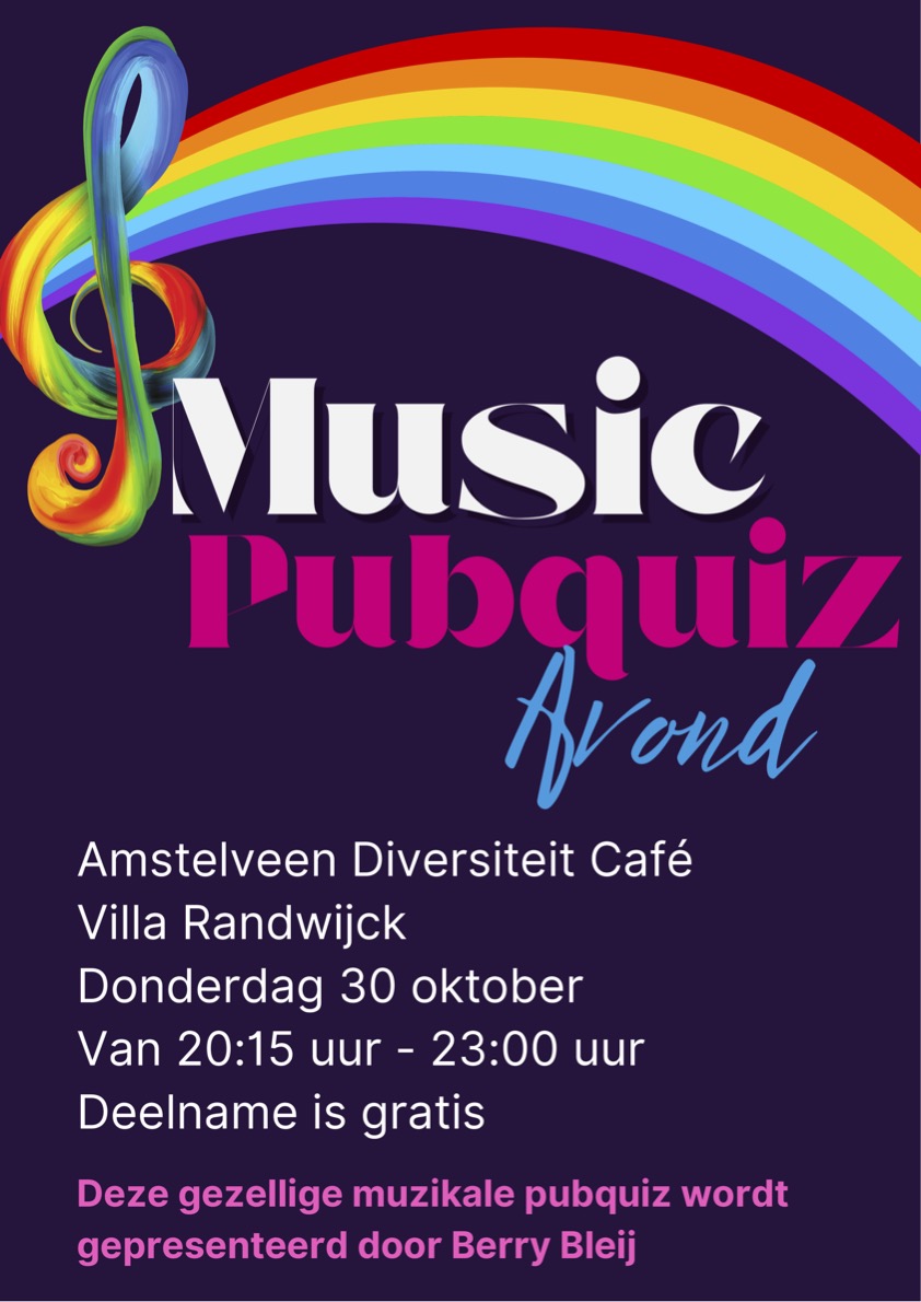 Op donderdag 30 oktober is er een muzikale pubquiz onder leiding van Berry Bleij. Dit wordt weer een avond vol muziekfragmenten, leuke vragen én gezelligheid. Fijn als je je even aanmeld!
